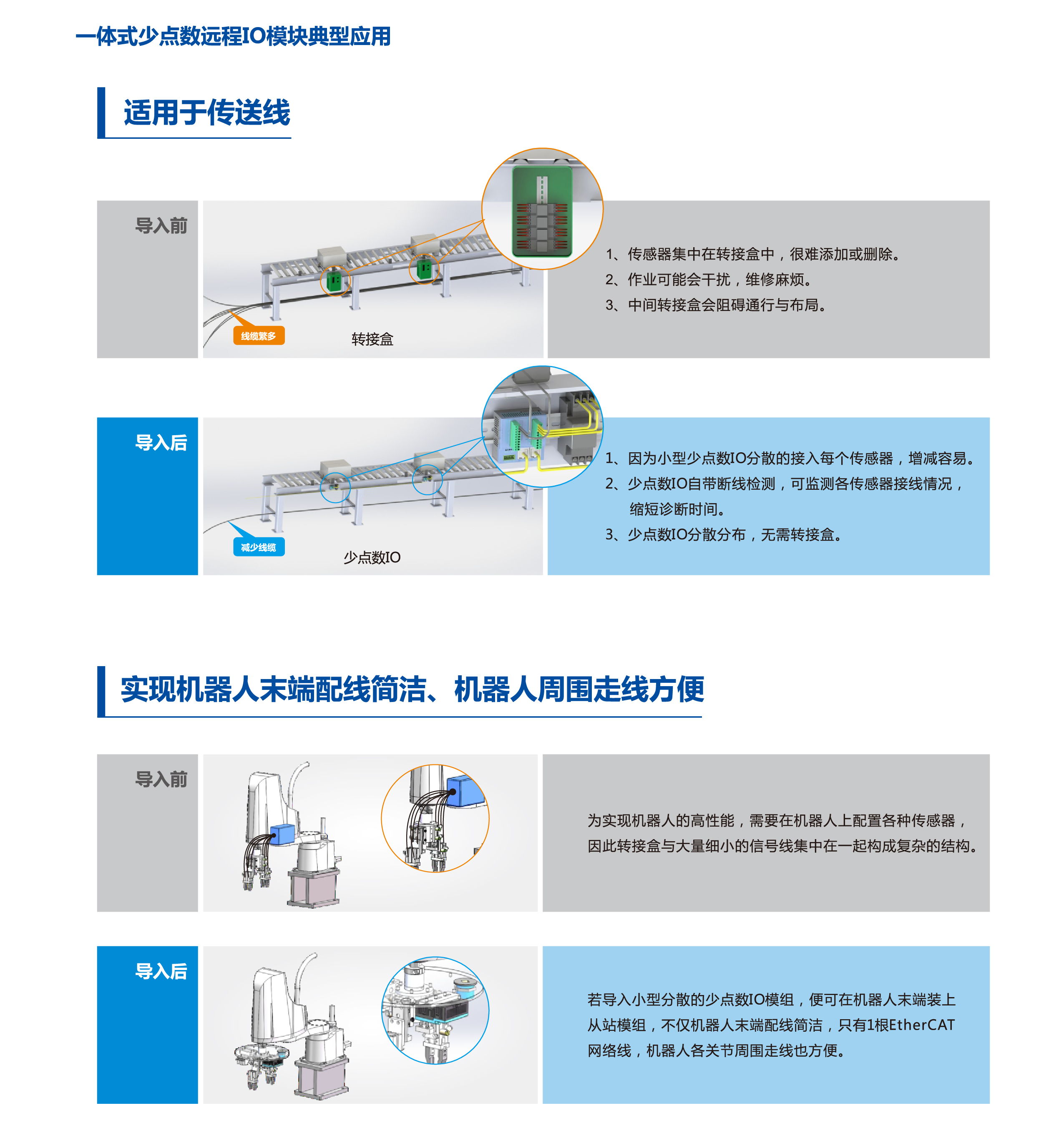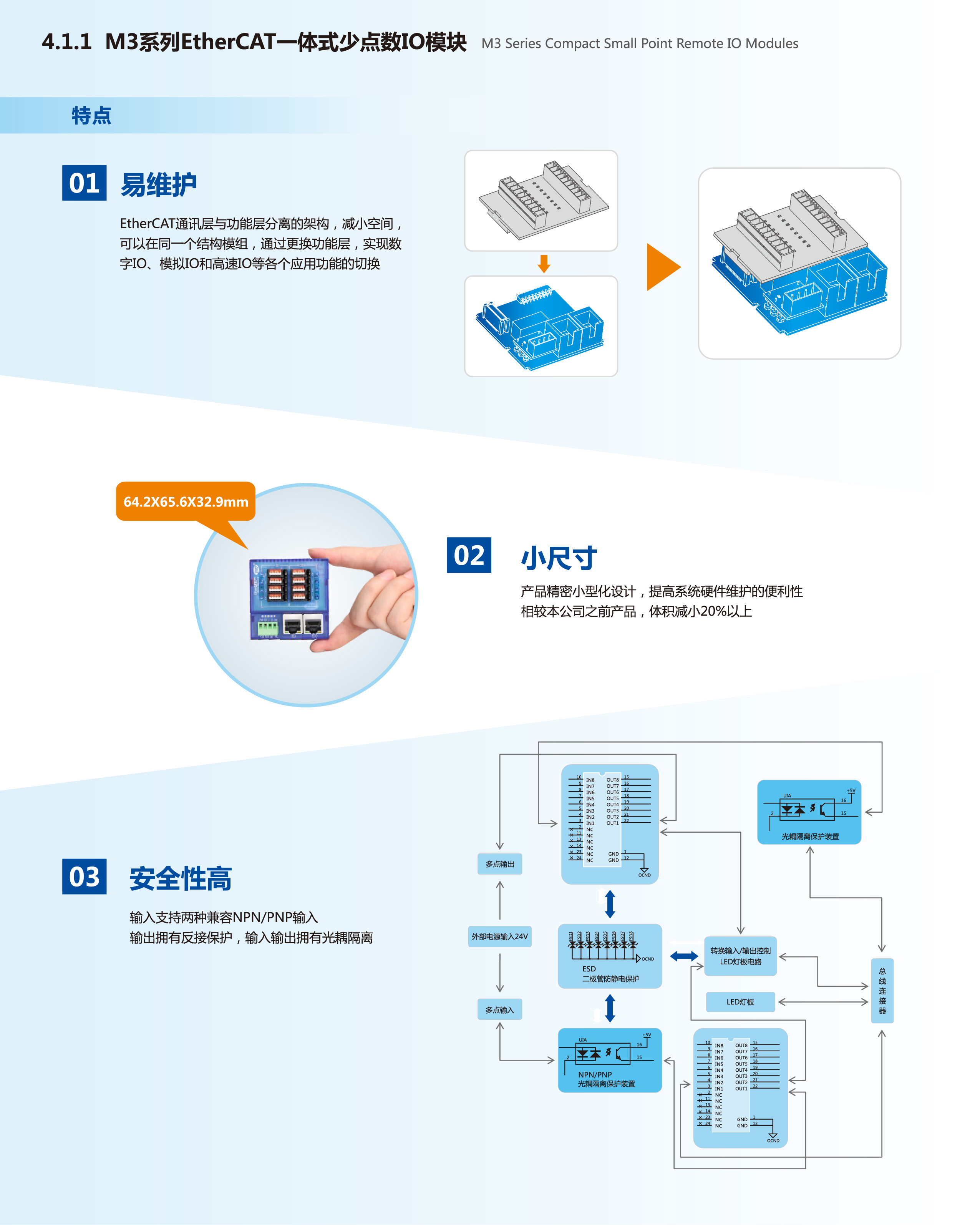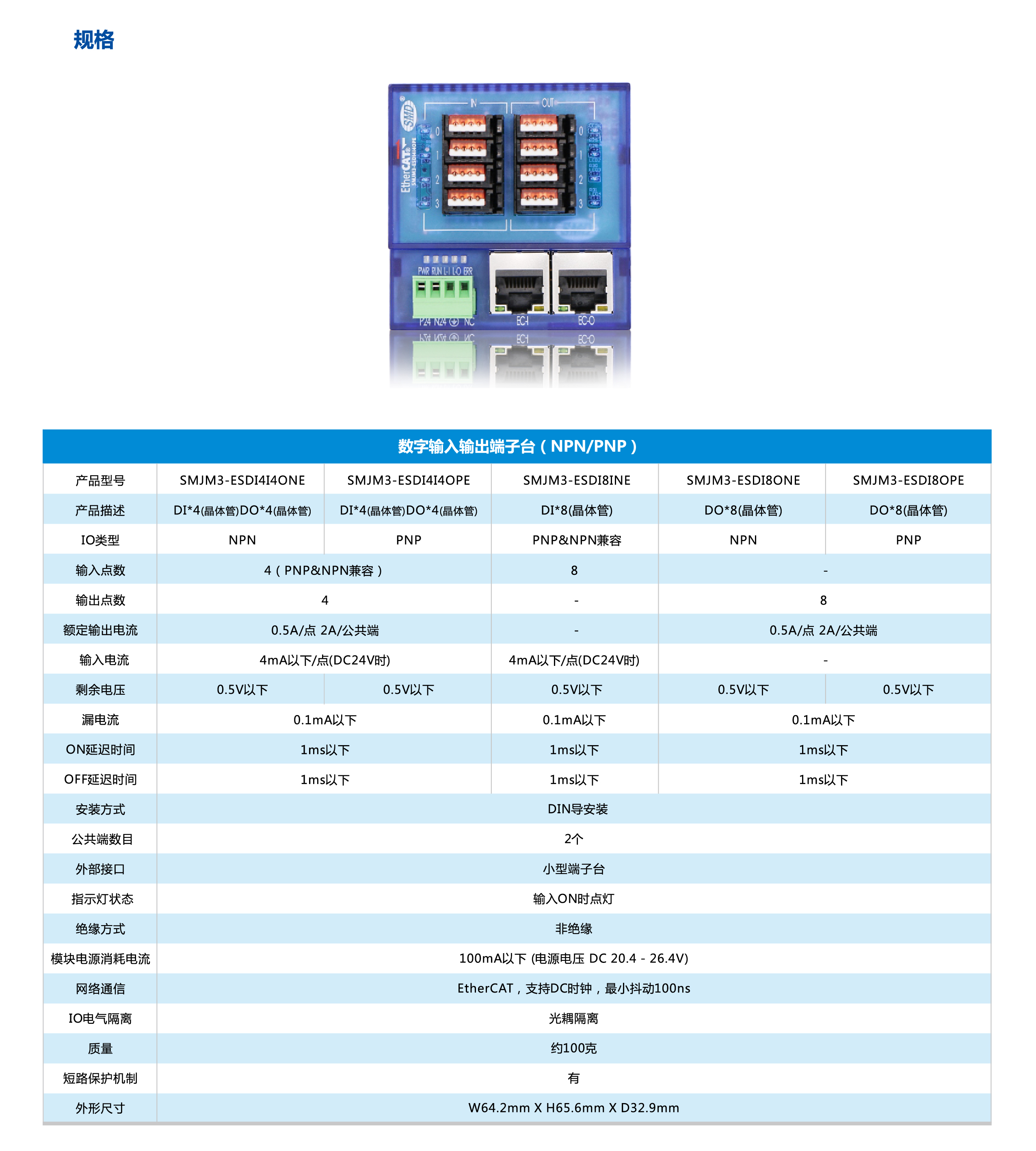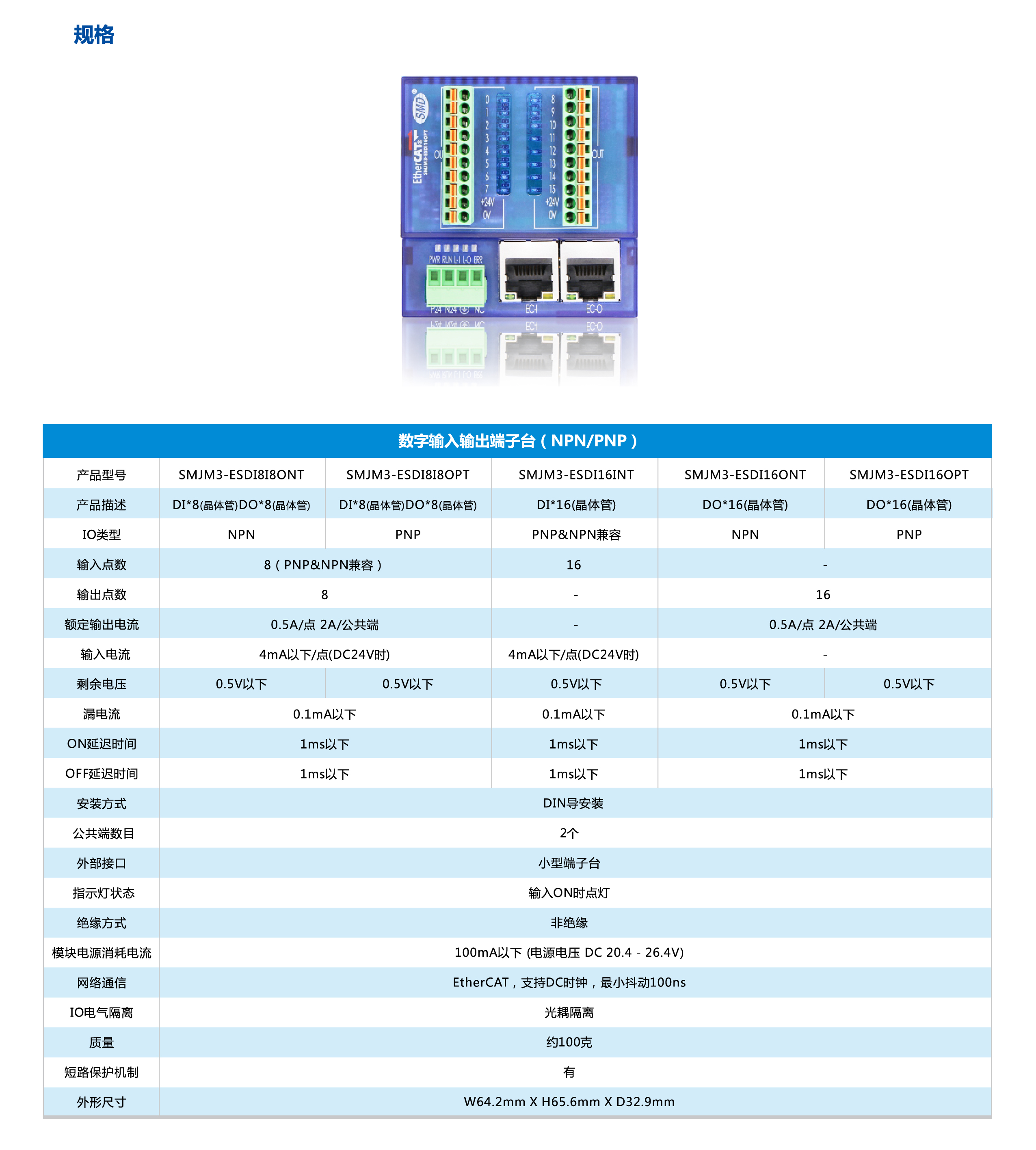 少點(diǎn)數(shù)及多點(diǎn)數(shù)遠(yuǎn)程IO是速美達(dá)自主研發(fā)的一款總線產(chǎn)品。將通訊端口,電源模塊,IO模塊集成在單個(gè)模塊上。其擁有體積小、結(jié)構(gòu)緊湊、 接線簡(jiǎn)單、 接線接口豐富、 性能穩(wěn)定、 可靠等特點(diǎn)。目前支持EtherCAT 總線,后續(xù)會(huì)增加CC-LINK,PROFINET等總線接口。有多種型號(hào)類型以及輸入輸出點(diǎn)可供選擇,單個(gè)模塊最大可支持48個(gè)信號(hào)點(diǎn)。