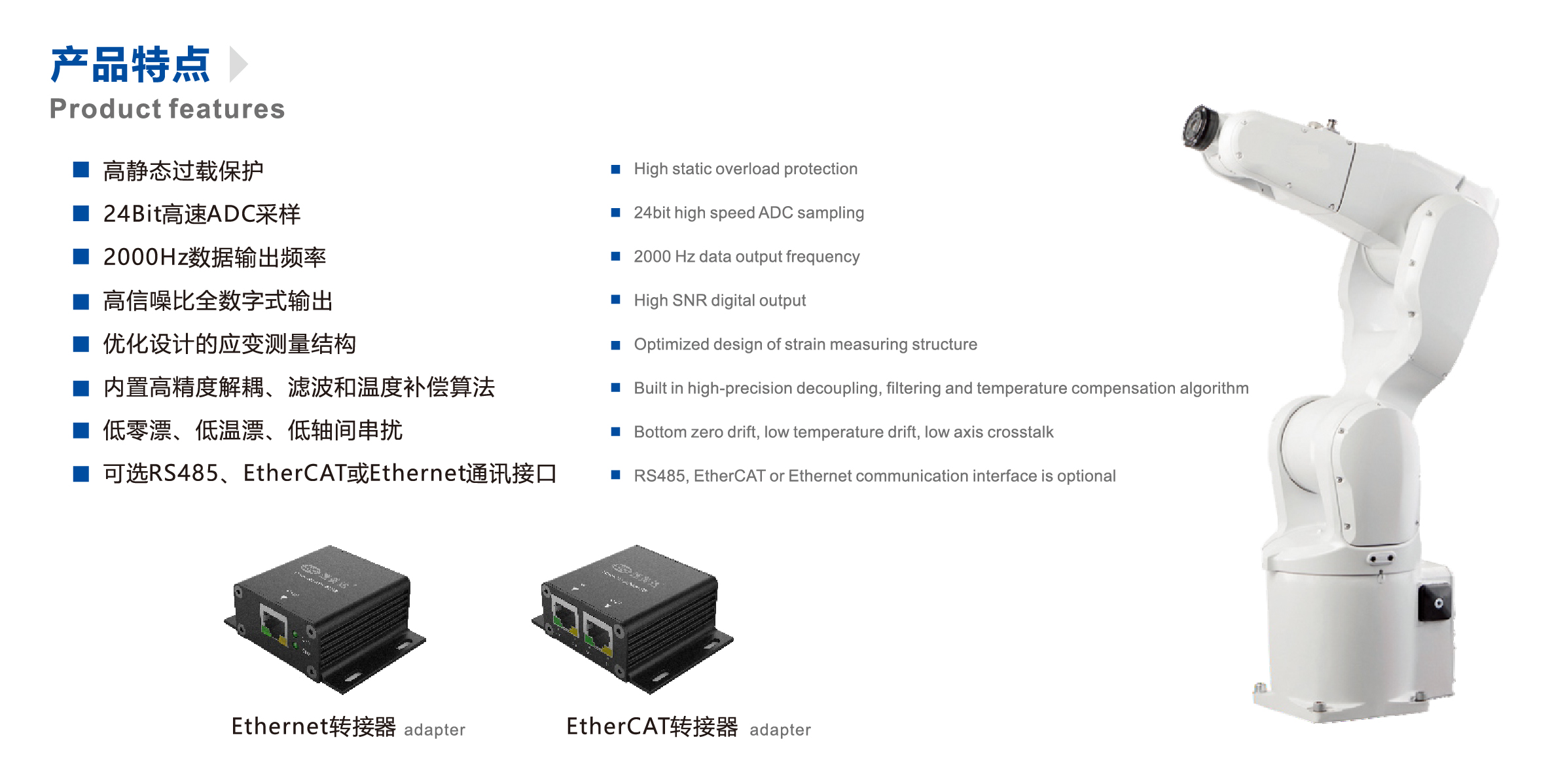 ?控傳感器可實時測量XYZ三個?向所受到的力和力矩。高精度應變計及結構設計實現了更高的信噪比和靈敏度,內置溫度補償算法大大降低了由溫度變化導致的溫度漂移。六維力傳感器應用于工業(yè)機器人、協(xié)作機器人、外骨骼機器?、醫(yī)療康復機器人、柔性夾爪和機器人關節(jié)、自動化測量、控制及風洞測試等。