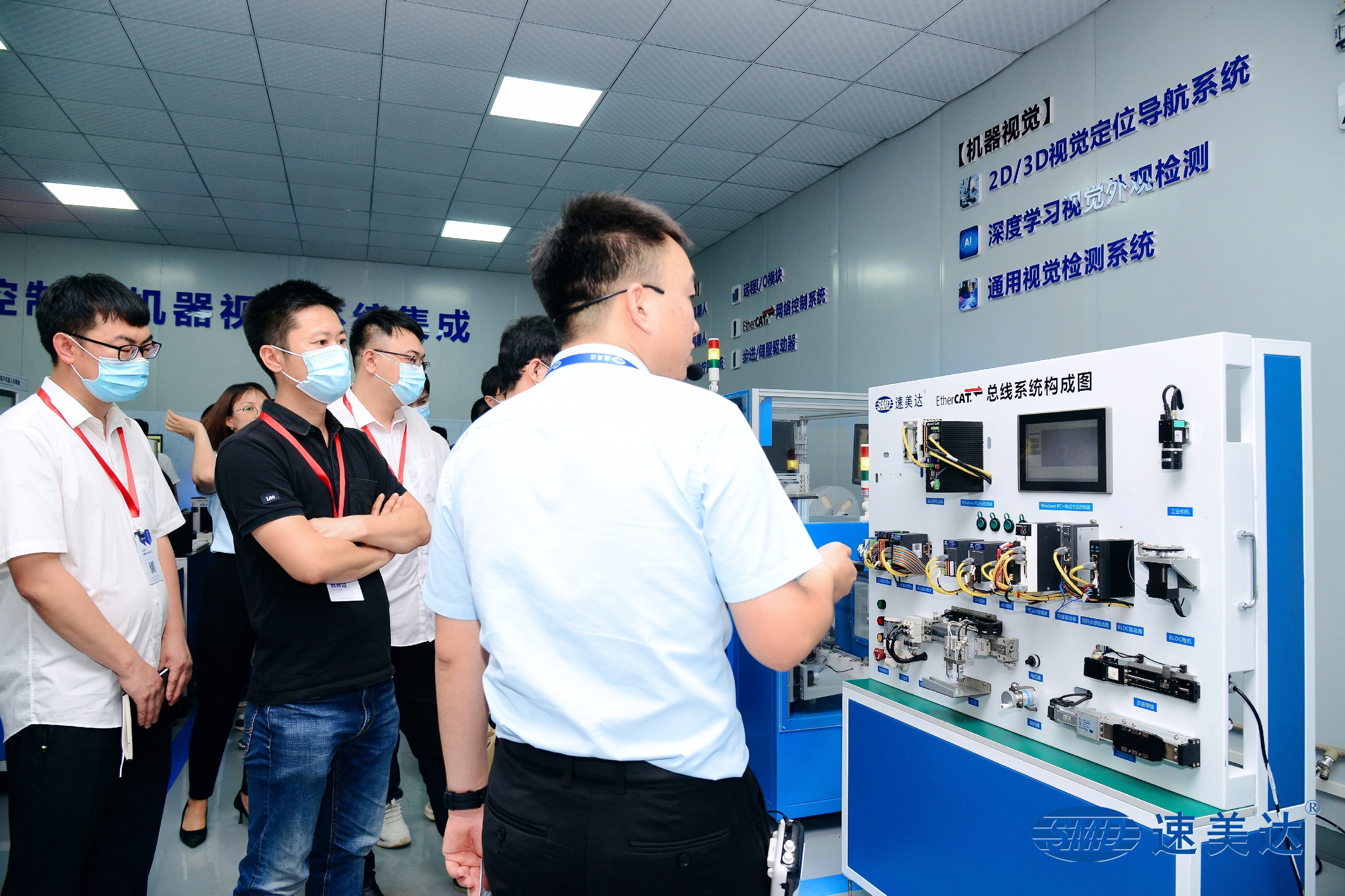 當(dāng)天下午,客戶陸續(xù)來到速美達(dá)東莞長安運(yùn)營總部,依次參觀系統(tǒng)集成展廳、機(jī)器人培訓(xùn)室、設(shè)備展廳以及系統(tǒng)集成測試區(qū)。展廳講解員向客戶重點(diǎn)介紹了速美達(dá)軟運(yùn)動控制整合系統(tǒng)應(yīng)用、單軸機(jī)器人系列產(chǎn)品、機(jī)器視覺系統(tǒng)、機(jī)器人及周邊配套產(chǎn)品、培訓(xùn)教學(xué)設(shè)施設(shè)備、系統(tǒng)集成測試場景等,讓客戶對于速美達(dá)各個產(chǎn)品系列有了進(jìn)一步的了解。