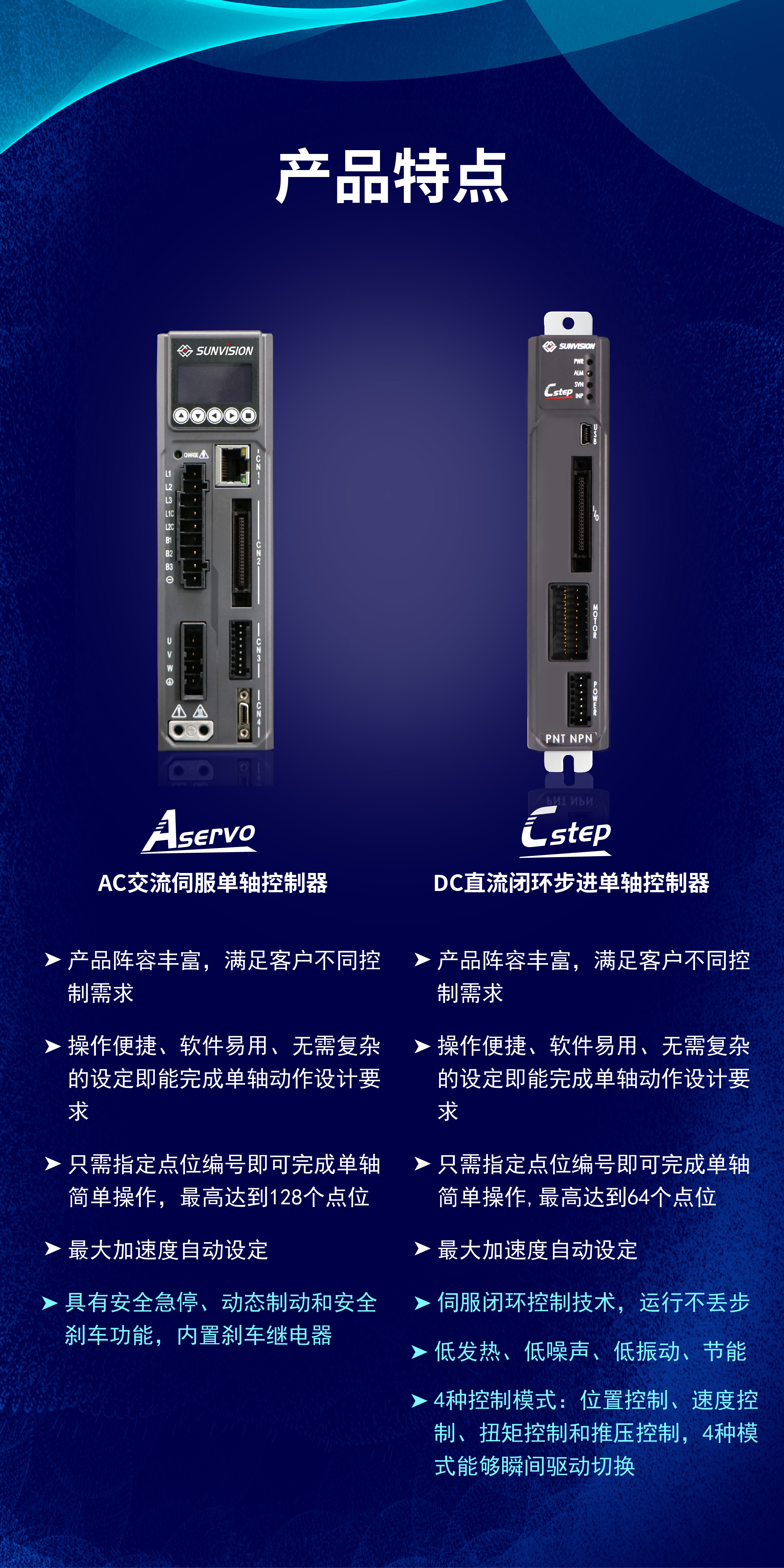 在EtherCAT軟運動控制的大環(huán)境下,為了滿足工業(yè)控制領(lǐng)域的實時性和數(shù)據(jù)通信要求,盛為興自主研發(fā)了Aservo系列AC交流伺服以及Cstep系列DC直流閉環(huán)步進單軸控制器,兩款控制器均可滿足客戶不同需求,匹配單軸應用功能產(chǎn)品,結(jié)合軟運動控制技術(shù)和信息化技術(shù)融合于一身,更好的搭配單軸模組。