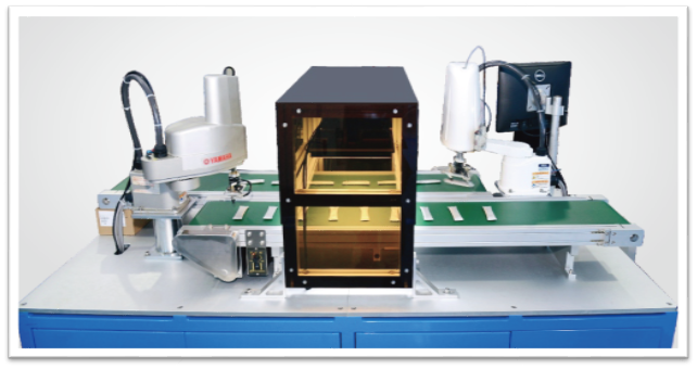 此樣機(jī)展示SCARA機(jī)器人跟隨傳送帶同步取放料的功能。使用醫(yī)用試劑盒作為演示產(chǎn)品,兩臺(tái)SCARA機(jī)器人協(xié)同作業(yè),高速,精密,機(jī)器人的最高CT可做到60PPM。