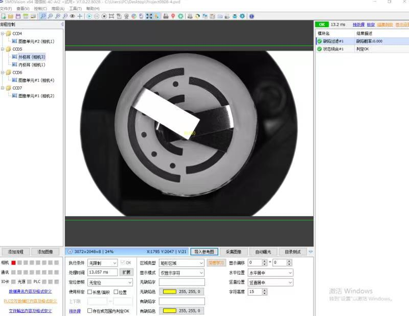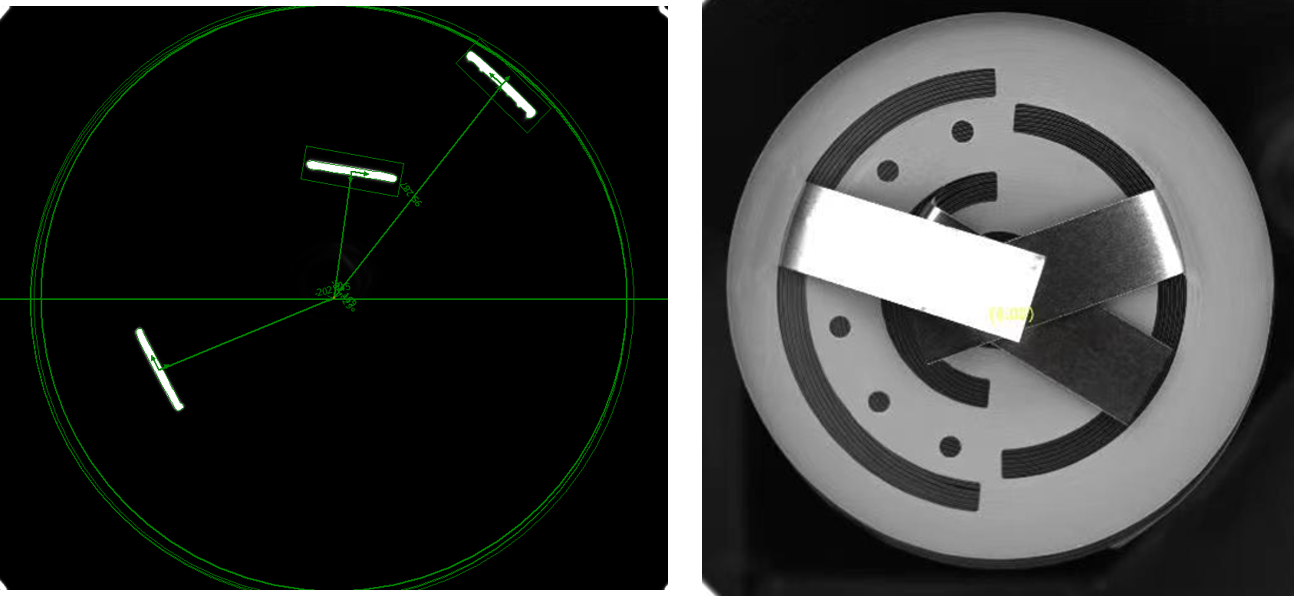 通過工業(yè)相機(jī)、光源及鏡頭的硬件配合,將被拍攝圓柱電芯極耳進(jìn)行定位成像傳送至速美達(dá)視覺軟件中,根據(jù)極耳成像效果計(jì)算內(nèi)中外極耳最佳角度,完成面墊入殼極耳折彎操作,同時(shí)采用深度學(xué)習(xí)對折彎后的效果進(jìn)行判定,樣本越多越精準(zhǔn)。