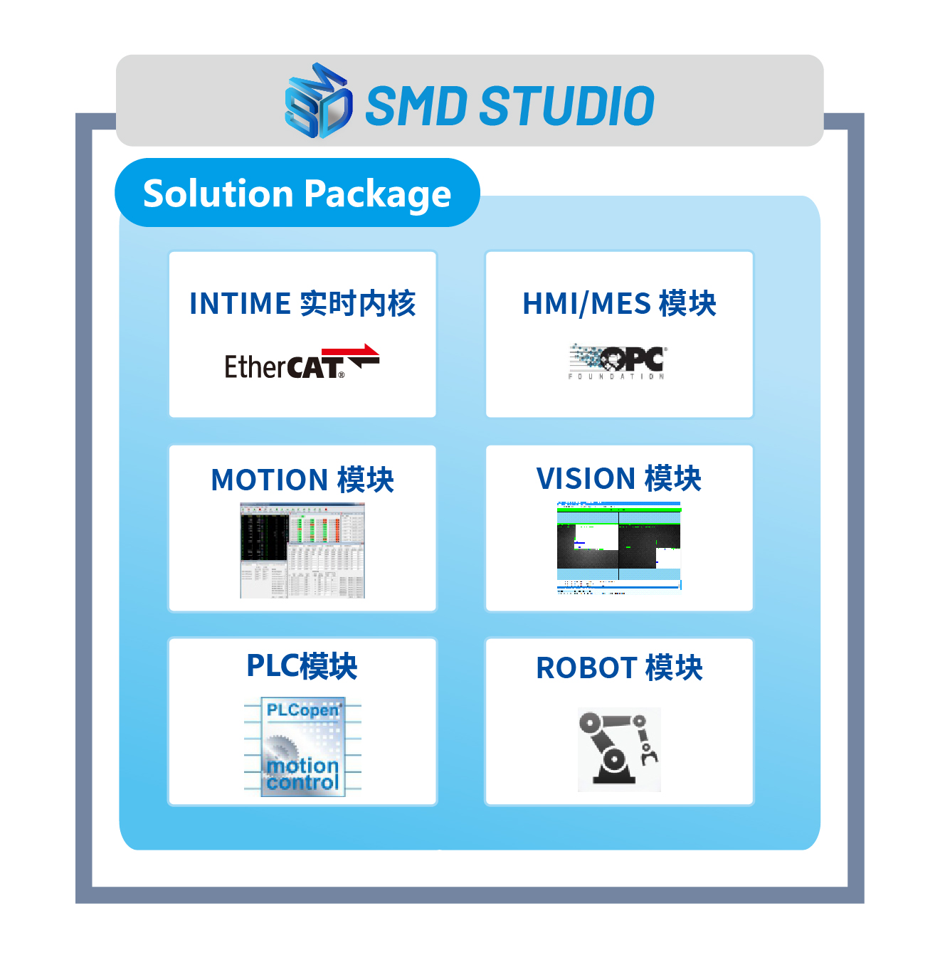速美達EtherCAT軟運動整合控制系統(tǒng)——SMD STUDIO,配備軟PLC、運動控制、機器人、人機界面、機器視覺等模塊。采用 windows 系統(tǒng),僅1臺PC可對邏輯、多軸、機器人、視覺進行整合處理;通過借助 Intime 實時系統(tǒng)及CPU內(nèi)核分離,能實現(xiàn)高速高精度運動控制;采取 EtherCAT 省配線方式,減少作業(yè)周期,提高工作效率。相比于傳統(tǒng)運動控制,軟運動控制擁有更好的靈活性、可擴展性、可維護性、性價比,更有效的提高企業(yè)產(chǎn)能效率,降低成本。